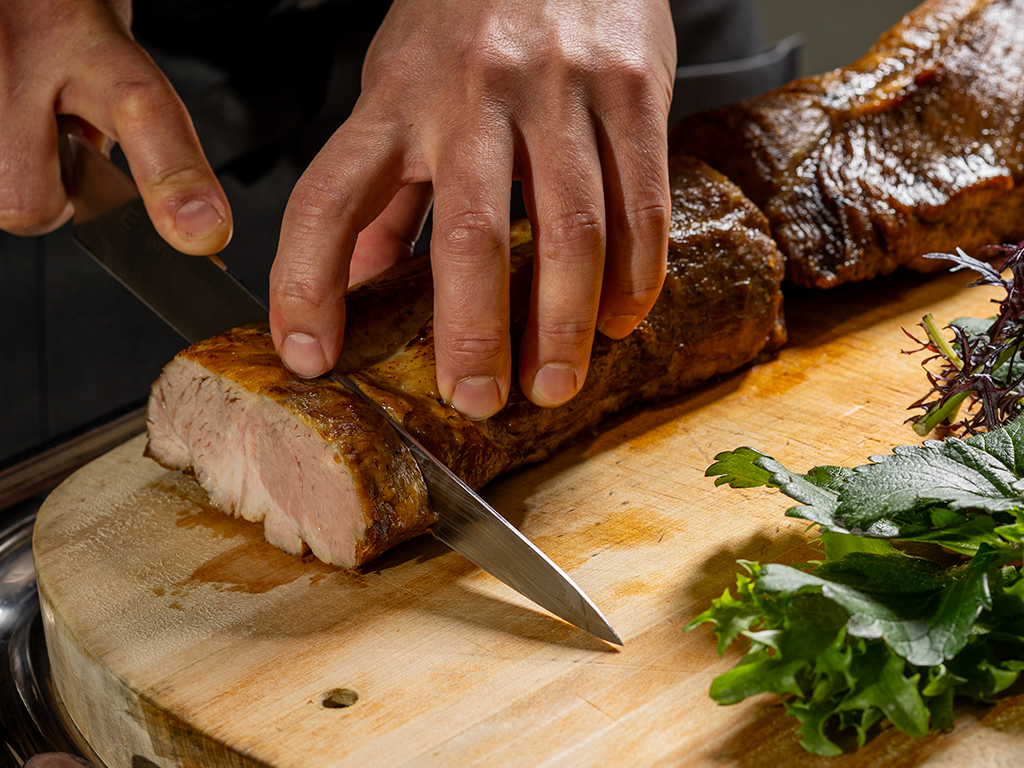 目の前で切り分けるローストポークを
