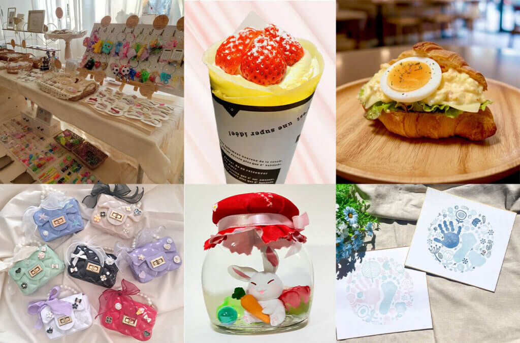 アクセサリーやキャンドル作りワークショップ、ベビー・キッズ向けアイテムの販売、体操体験など、親子で楽しめるワークショップ&販売ブースを多数ご用意しております。またクレープやピザ、韓国グルメなどのキッチンカーも登場します。