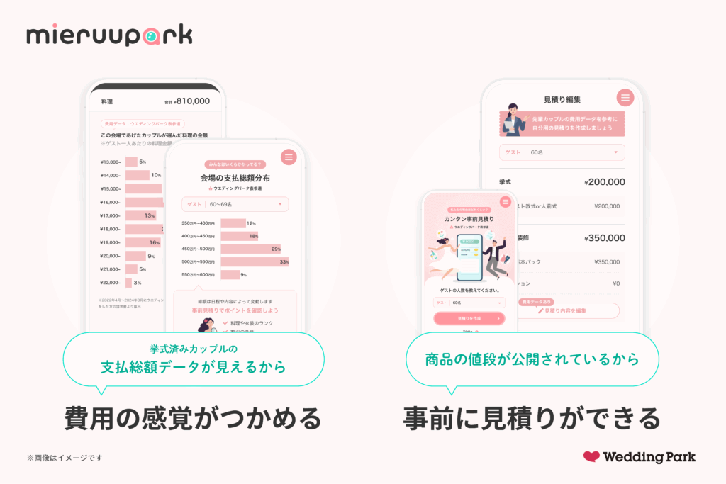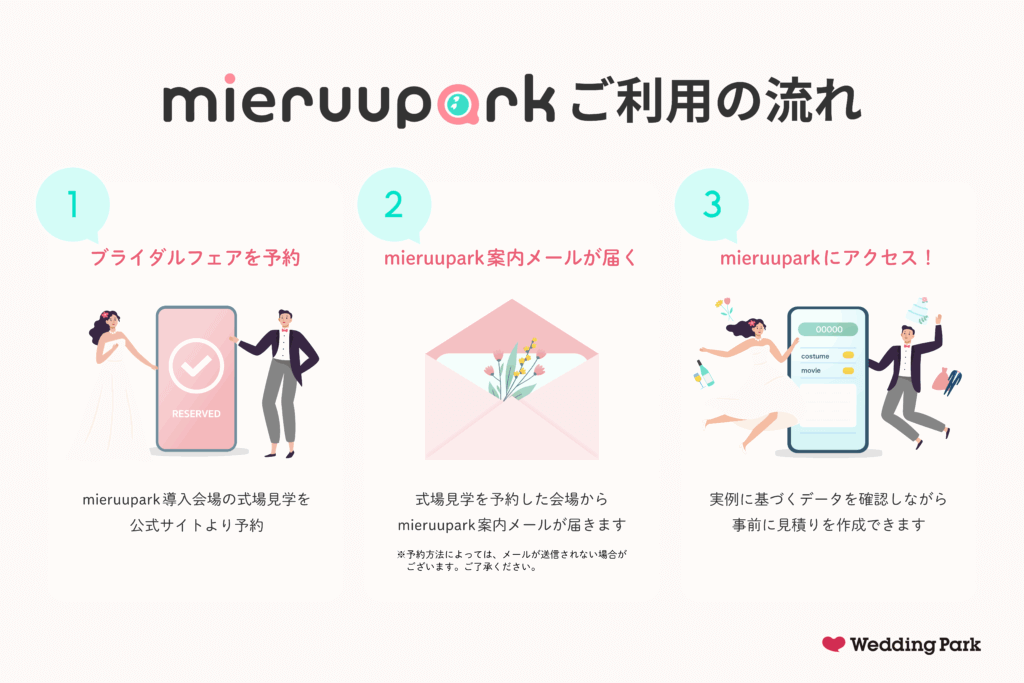株式会社ウエディングパークが提供するサービスmieruuparkは、リアルな料金データをもとに、フェア来場予約をしたカップルが自由に費用シミュレーションを行えるWEBサービスです。